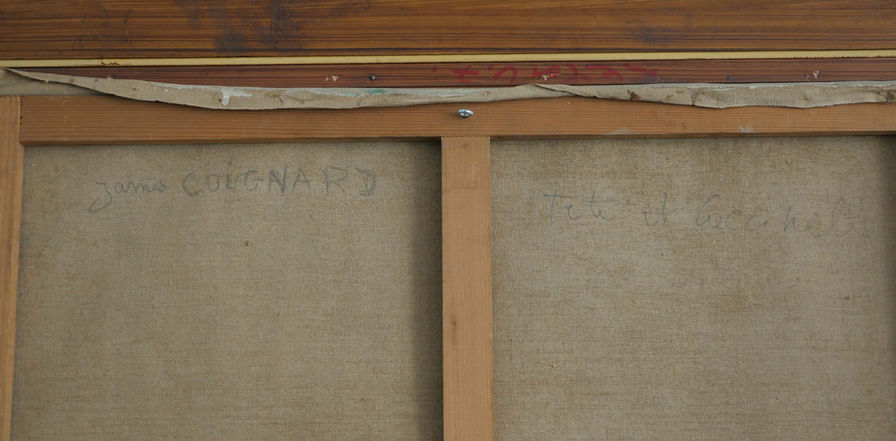 "Tête et coccinelle" traduit le goût de Coignard pour les compositions surréalistes, aux formes fantasques et couleurs extravagantes. A la croisée de l'abstraction et de l'expressionisme. L'artiste livre sa perception imaginaire du monde dans une peinture aussi complexe que ludique